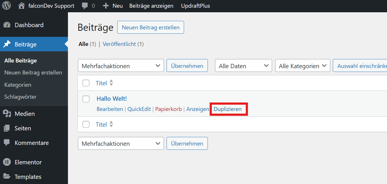 - Gehen Sie im WordPress-Dashboard auf „Beiträge“ und duplizieren Sie anschließend einen bestehenden Beitrag, sodass Sie das vorhandene Layout behalten. In der Regel finden Sie auch eine Beitragsvorlage (Name i.d.R. „Beitragsvorlage“ oder „Beitragstemplate„).