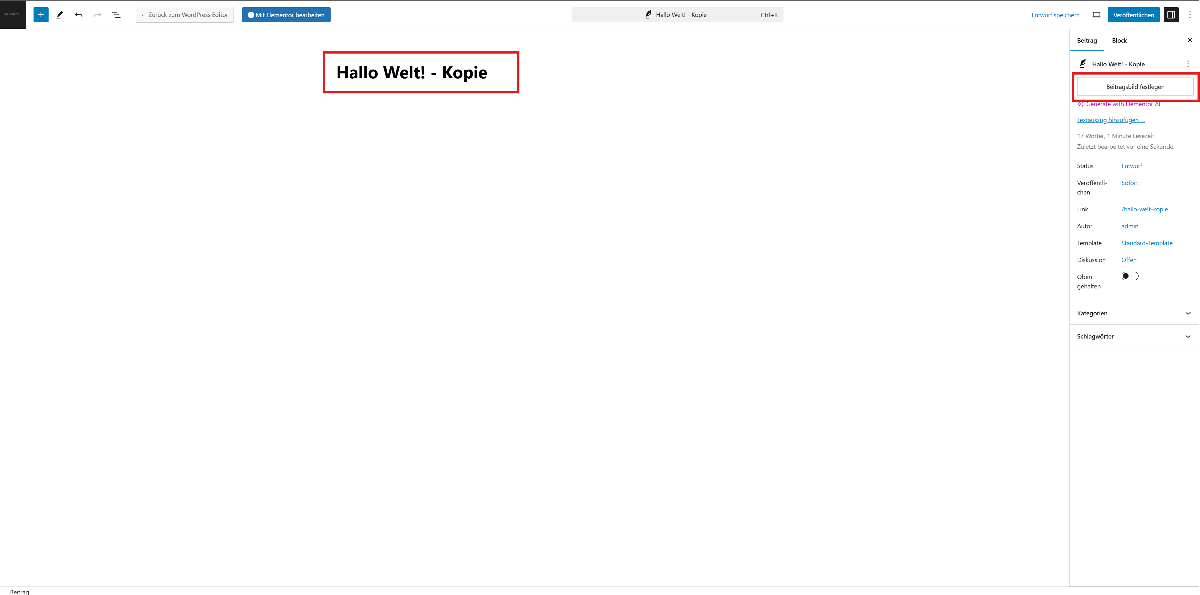 - Passen Sie direkt nach der Erstellung des Beitrags den Titel und das Beitragsbild an (siehe Screenshot). Der Titel sollte klar und ansprechend sein, während das Beitragsbild eine visuell passende Ergänzung darstellt.