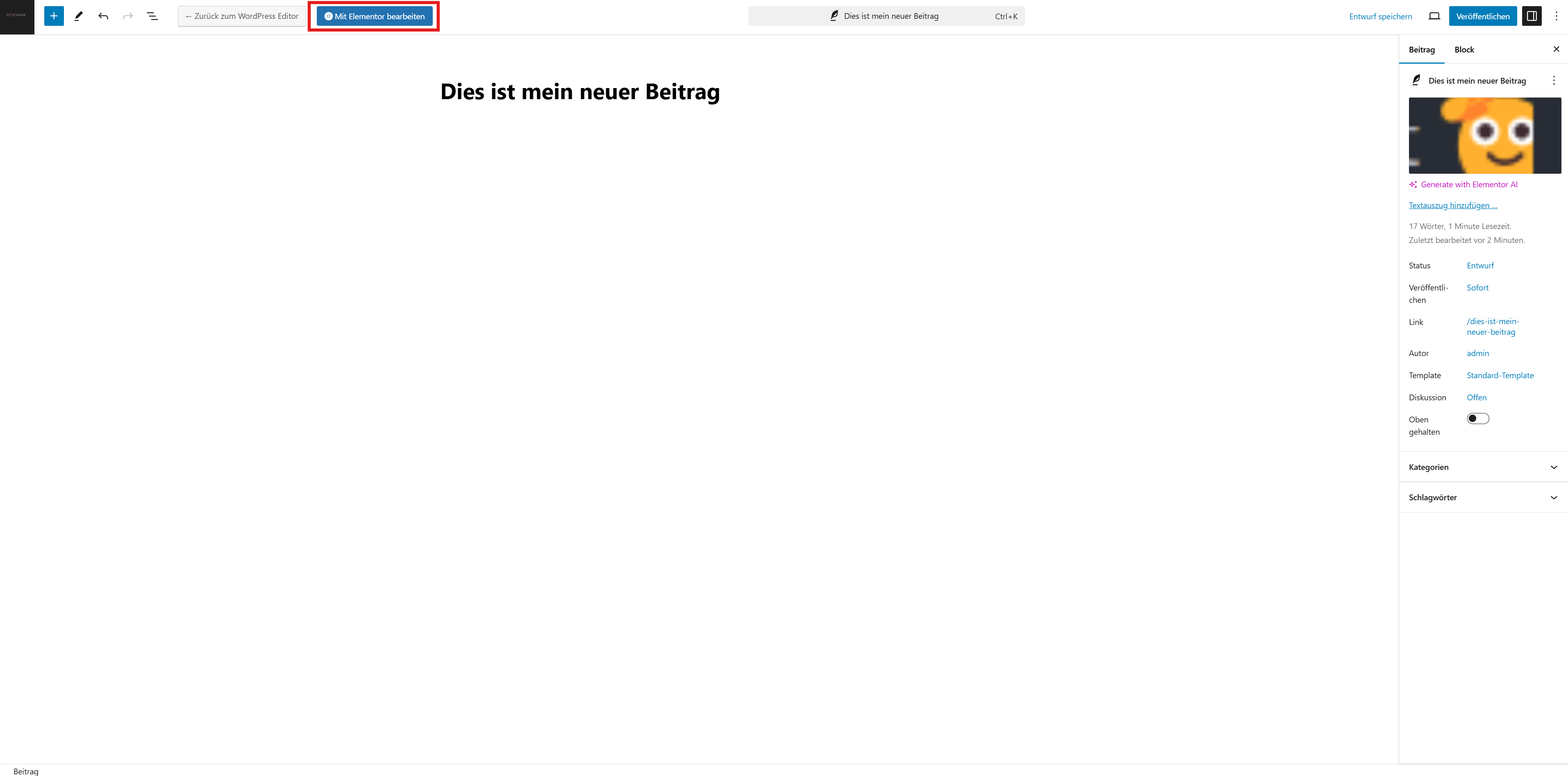 - Nachdem Sie Titel und Beitragsbild festgelegt haben, klicken Sie auf den Button „Mit Elementor bearbeiten“. Nun können Sie den Inhalt des Beitrags in Elementor anpassen und gestalten. Hier stehen Ihnen alle Elementor-Elemente zur Verfügung, um Absätze, Bilder, Videos, Listen und mehr hinzuzufügen und zu formatieren.