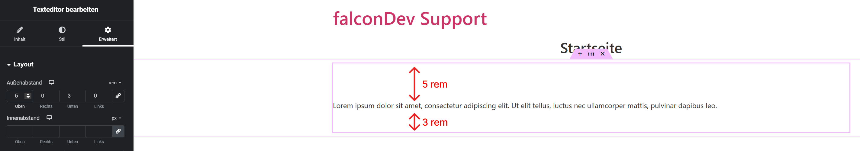 - Im Tab Erweitert finden Sie die Optionen Innenabstand (Padding) und Außenabstand (Margin).
